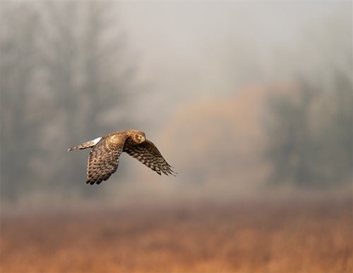 The Northern Harrier hawk is a winter visitor in Arizona. It is known for its slow and graceful glide or “dance” over fields and grasslands, looking and listening for prey. The males are gray in color, nicknamed the gray ghost, while the females, like the one pictured here, are brown. Both males and females have yellow eyes and a white patch at the base of the tail. Larger than the males, the females have a wingspan of up to 48 inches.